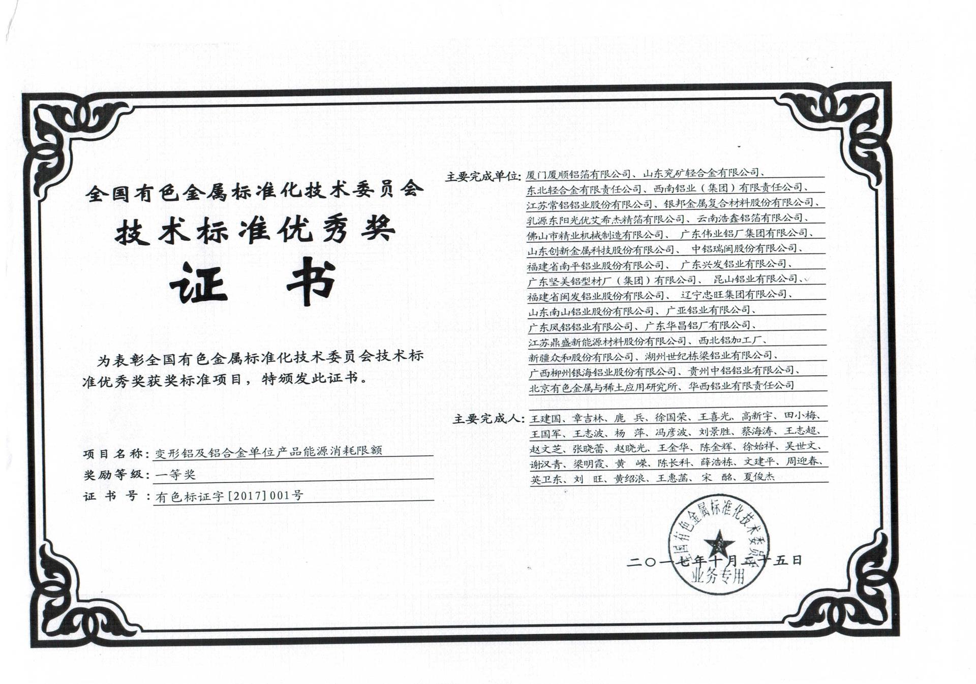 技術(shù)標(biāo)準(zhǔn)優(yōu)秀獎證書